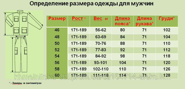 Пошитий з матеріалу ТВІЛ (50% х/б,/50% поліестер) з водовідштовхуючим просочуванням.